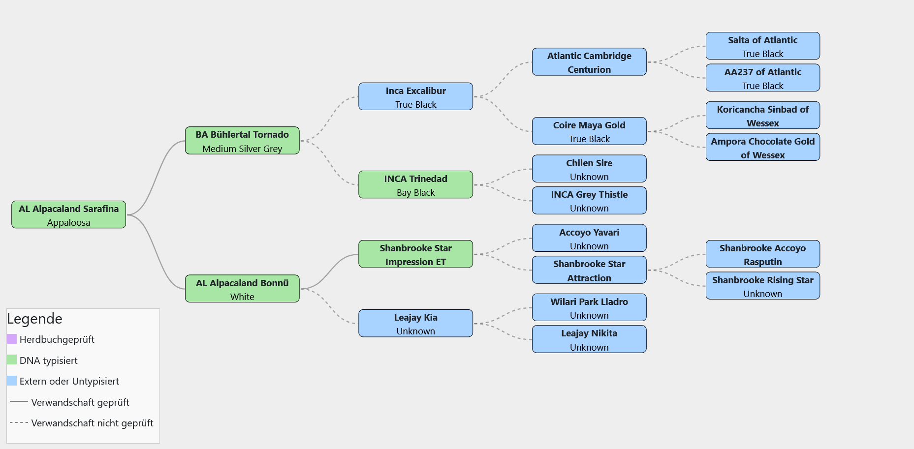 Ihre Mutter ist eine weisse Shanbrooke Star Impression Tochter, ihr Vater ist BA Bühlertal Tornado. Alle ihre Fohlen sind Appaoloosa Fohlen, obwohl die Väter dazu jeweils einfarbige Hengste waren.