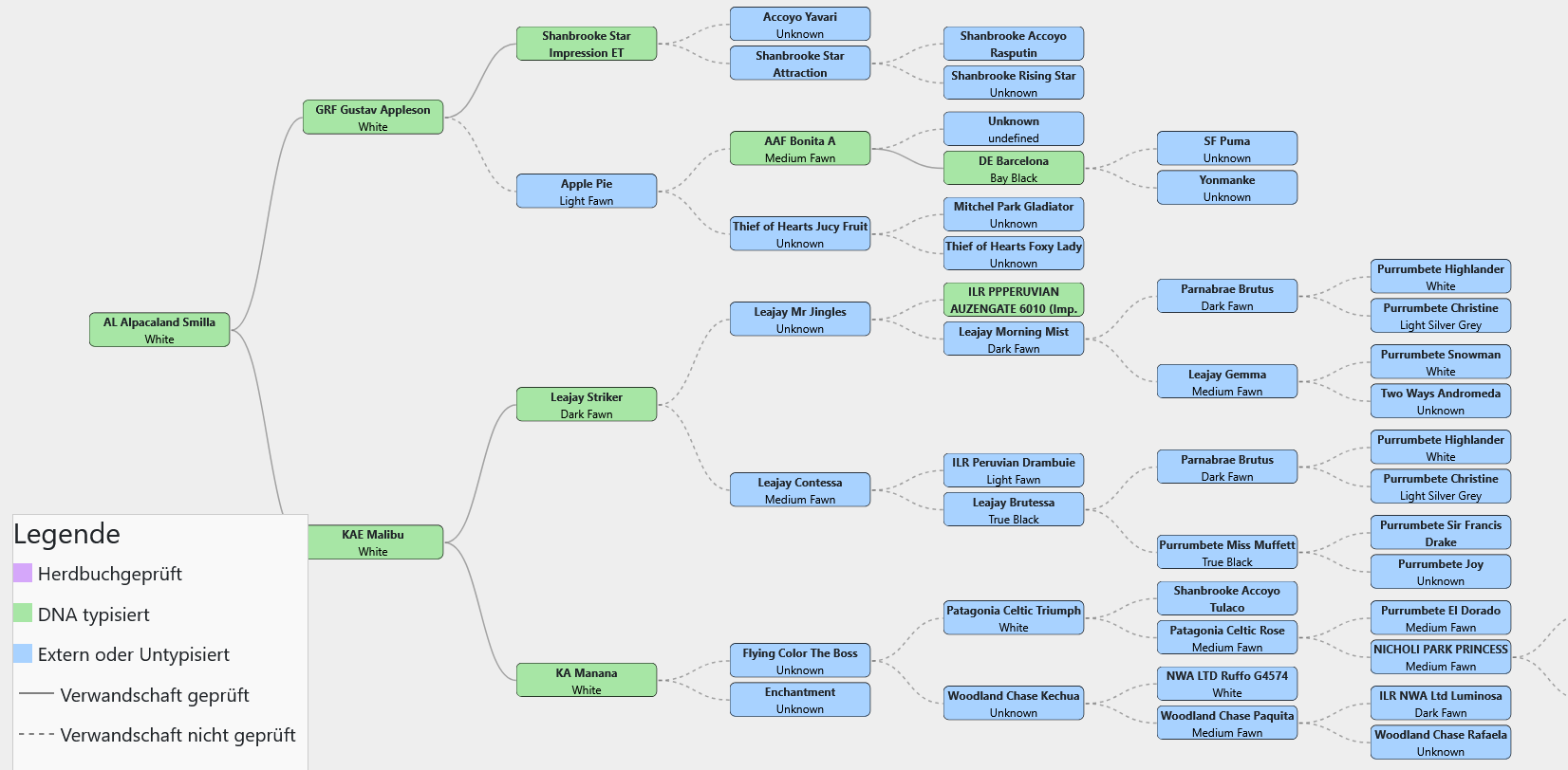 Smilla ist eine rein weisse Stute, beide Elternteile tragen auch die Farbe weiss. Bei den Großeltern jedoch kommt die Farbe fawn bzw beige ins Spiel.
